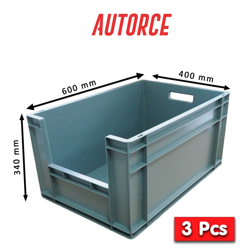 3x 66 Litre Heavy-Duty Industrial Plastic Crate Grey – Open Front Design