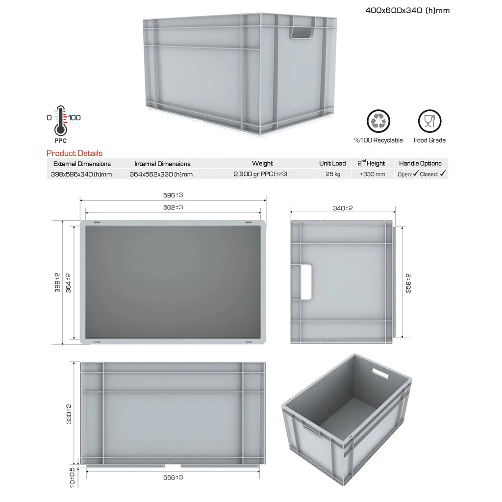 The 400x600mm base dimension enables efficient pallet loading:- Standard 800mm pallet: 2 containers across- Euro 800x1200mm pallet: 4 containers total- Industrial 1000x1200mm pallet: 5 containers total