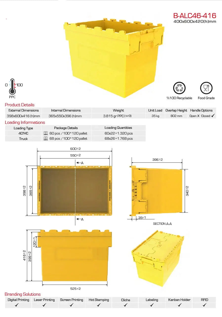 The 80-litre attached lid industrial storage box is a durable and versatile solution designed for warehousing, logistics, and retail applications. With its secure interlocking lid, this container ensures safe transportation and storage while protecting contents from dust and contamination.