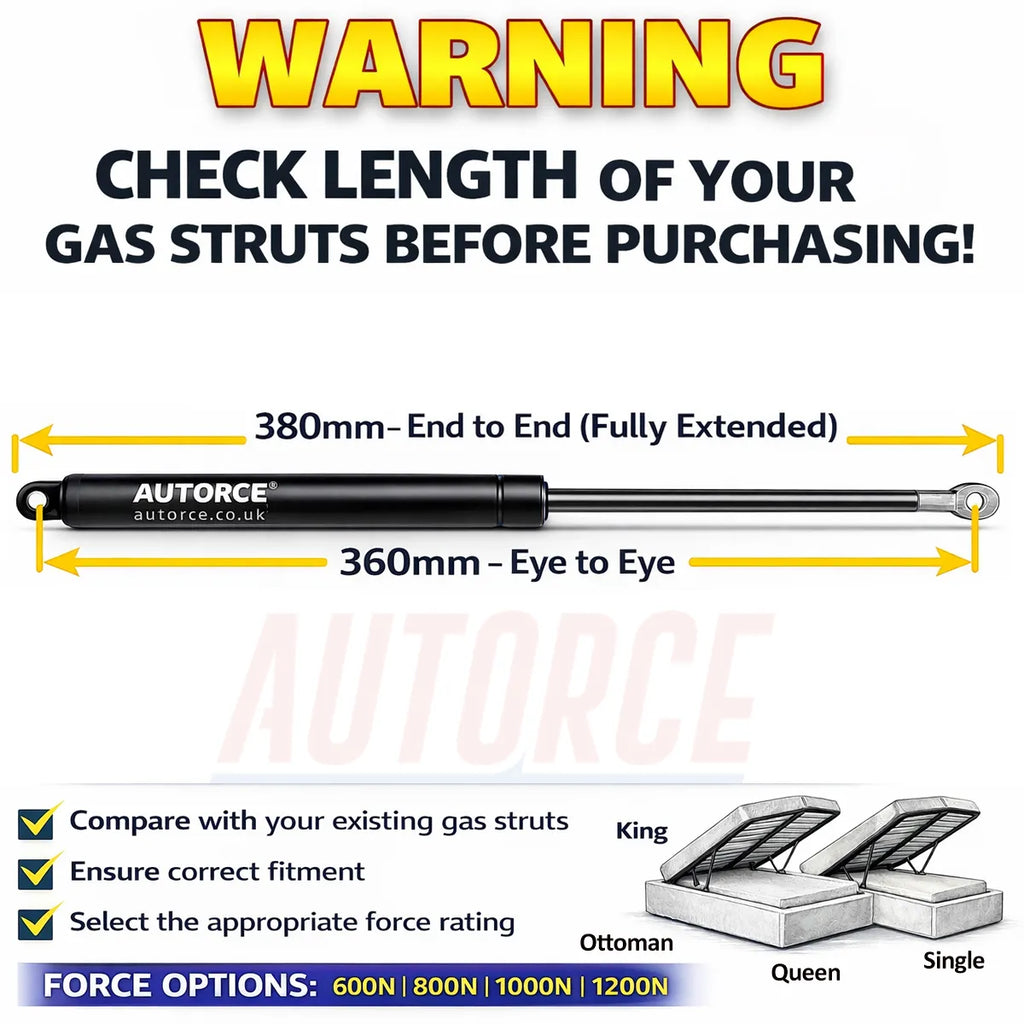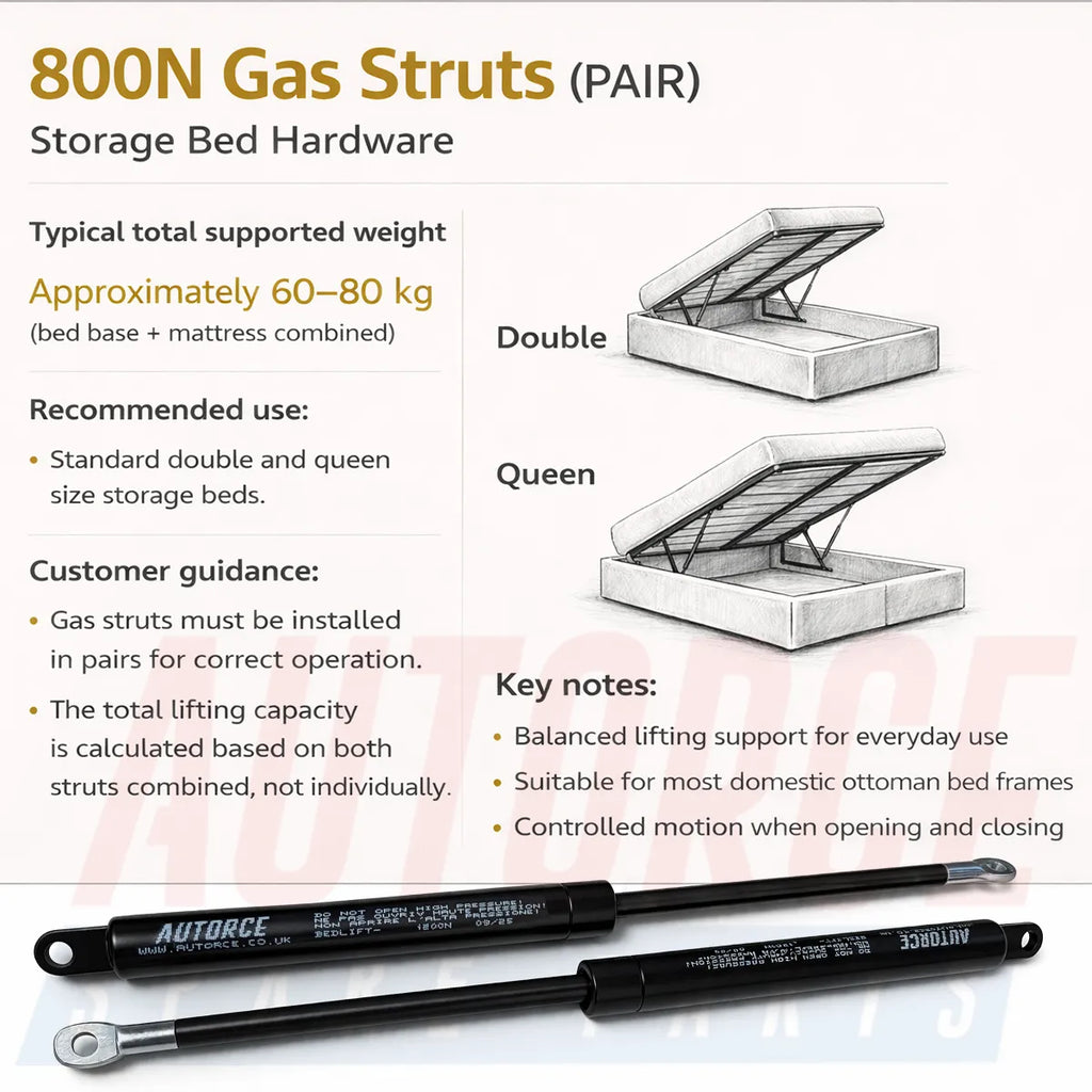 Restore confident, smooth lifting to your ottoman or storage bed with AUTORCE 800N gas struts — a reliable upgrade designed for everyday domestic use.